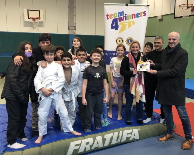 Im Beisein der Kinder der Team4Winners-Judo AG sowie deren Trainer Sauro Paoloni überreichte Stephan Lampen von Team4Winners der Konrektorin der Gemeinschaftsschule Dudweiler, Frau Isabel Spelz, die T4W-Partnerschulenplakette.