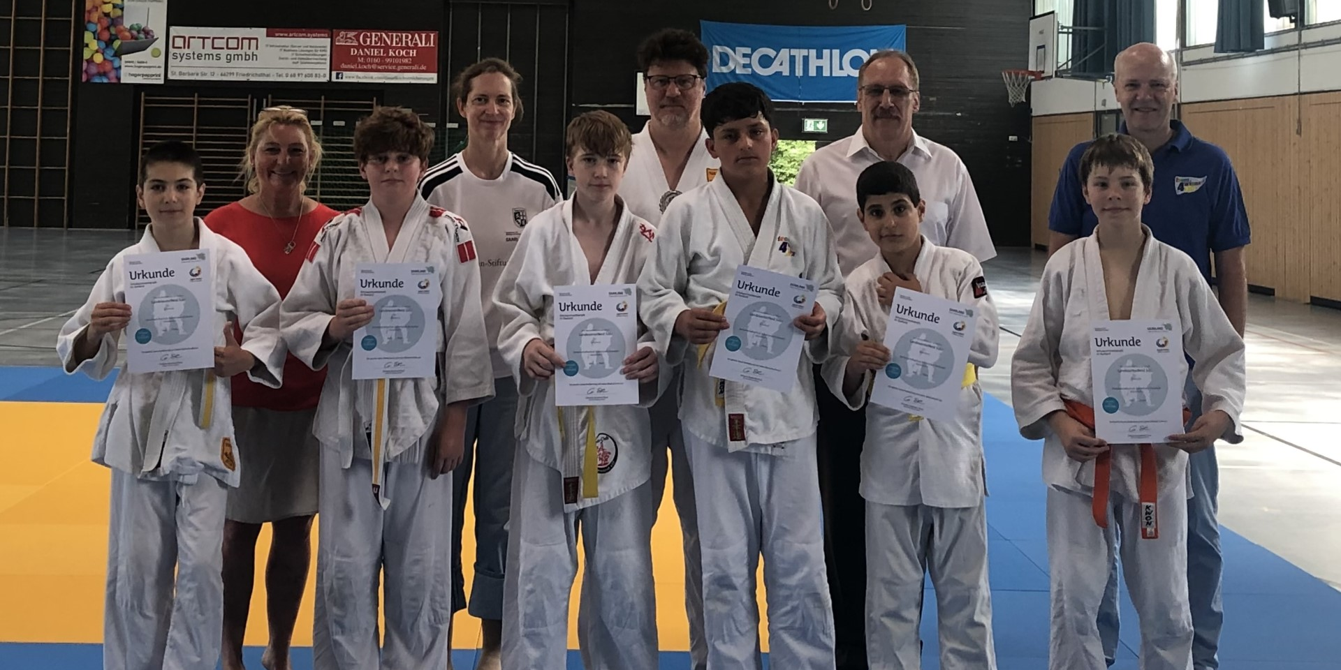 Isabel Spelz, 2. Stellvertretende Schulleiterin der Gemeinschaftsschule Dudweiler, der Trainer der Team4Winners Judo-AG, Torsten Sunkel, sowie Stephan Lampen von Team 4Winners freuten sich mit den Kindern über den erfolgreichen Abschluß des Turniers.